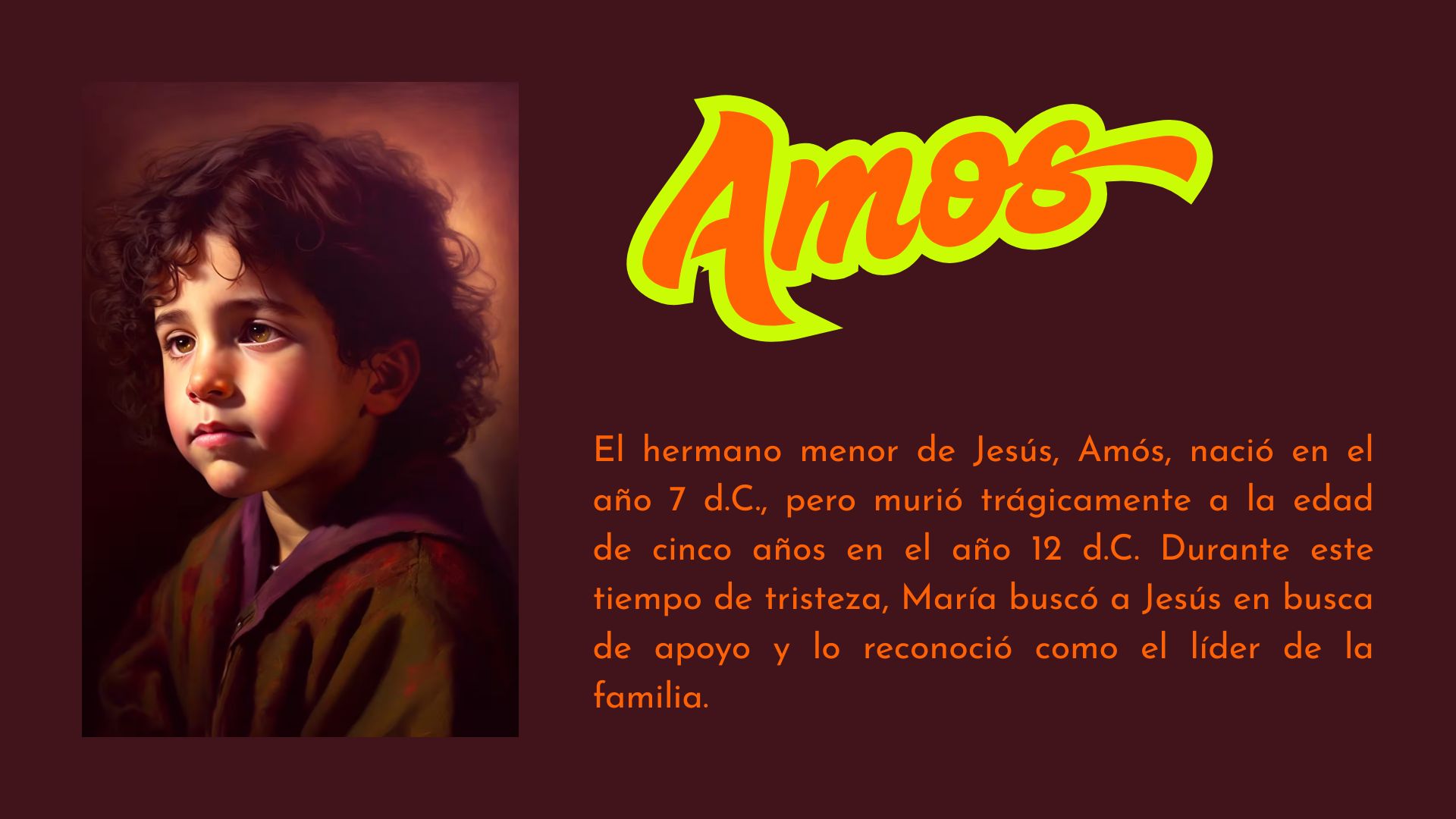 El hermano menor de Jesús, Amós, nació en el año 7 d.C., pero murió trágicamente a la edad de cinco años en el año 12 d.C. Durante este tiempo de tristeza, María buscó a Jesús en busca de apoyo y lo reconoció como el líder de la familia.